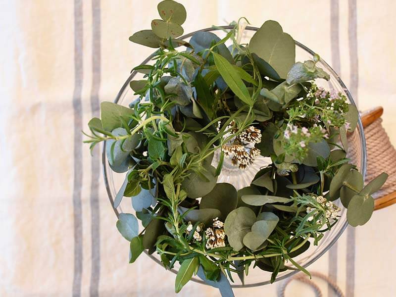 ユーカリをふんわりと束ねて、草原が広がるようにハーブが伸びていく様子をイメージしながらハーブや花を入れていきます。