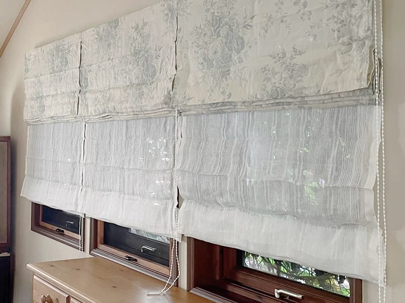 U様邸の木枠の小窓3つに、魅力的な「Roses Blue/ローゼスブルー」と「Naturals 23」の透け感のあるモスリンリネン生地を組み合わせたダブルシェードを連窓で3台設置しました。