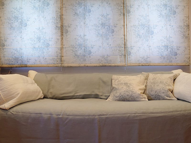ダブルシェードの下に配置された3人掛けソファには、「ローゼスブルー」のクッションカバーをコーディネート。さらに、ソファのクッションやシートには、ベルギー・リベコ社の「Naturals Celadon/ナチュラルズ セラドン」の淡いブルーリネン生地を使用しています。