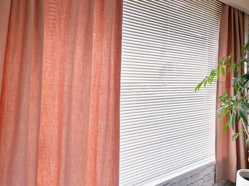 掃き出し窓に設置されたメタルブラインドの上にリナヘリンボーンホワイトのフラットカーテンが重ねられることで、シャープさと温もりの両方を感じさせる窓辺になりました。