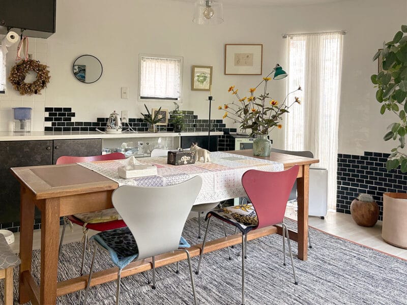 壁の一角にはS様ご自身でDIYされた黒いタイルがランダムに並び、白い壁面にハイセンスなアクセントを添えていました。黒を基調としたキッチンが凛とした存在感を放ちながらアンティーク家具と調和して、素敵な空間を生み出しています。