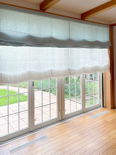 リネン生地でローマンシェードを仕立てる利点は、リネン特有のふっくらした畳上がりの美しさです。コットン生地はきちんと折れて畳まれますが、リネン素材は湾曲した畳上がりがポイント。光に透けたリネンストライプも湾曲して、ひとつのアートが完成しています。