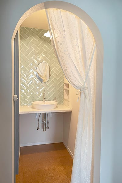 明るい色合いのパウダールームの間仕切りには軽やかな質感のMuslin Sheer Desert Rose / モスリンシアーデザートローズの2本プリーツカーテンが選ばれました。
