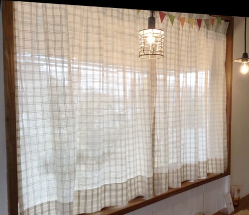 兵庫県三木市にある『食堂カフェYUZUNOHA』様よりご依頼をいただき、 店内用のカーテンを納品させていただきました。 オーダーいただいたのは、柔らかな風合いとどこか懐かしい風合いを感じられる チェック柄モスリン素材でのレースカーテン。 色柄がよく見えるように、すっきりめの1本プリーツスタイルで製作。 コットンの優しい素材感が、ナチュラルなお店のイメージとピッタリです。