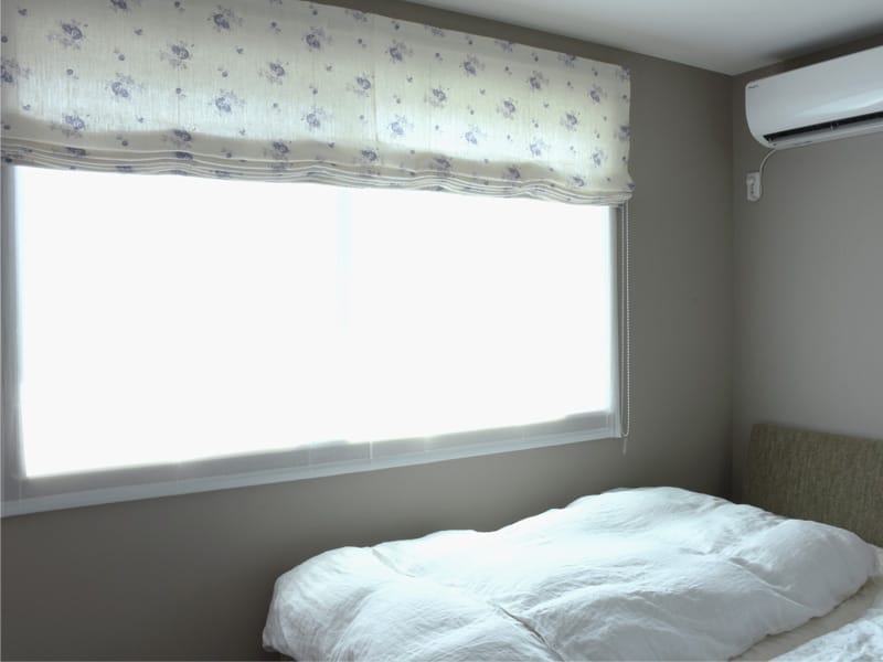寝室の幅の広い腰窓のカーテンは、機能的ですっきりとしたダブルシェード。シンプルで優しい雰囲気のShabbychic Rose PlumとMuslin Half Linenの組み合わせです。グレーのシックな空間に柔らかさを作り出しますね。
