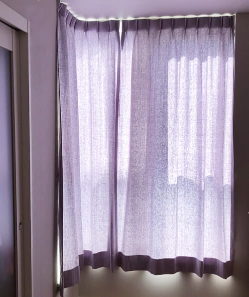 After / この窓には、ドアまで続くカーブレールをご提案させて頂きました。リネンカーテンの生地は厚地のしっかりしたNaturals Aereoを選ばれたS様。その生地感を生かすためにスタイルは敢えてシンプルにボリューム控えめで、レール幅の1.5倍の1本プリーツです。