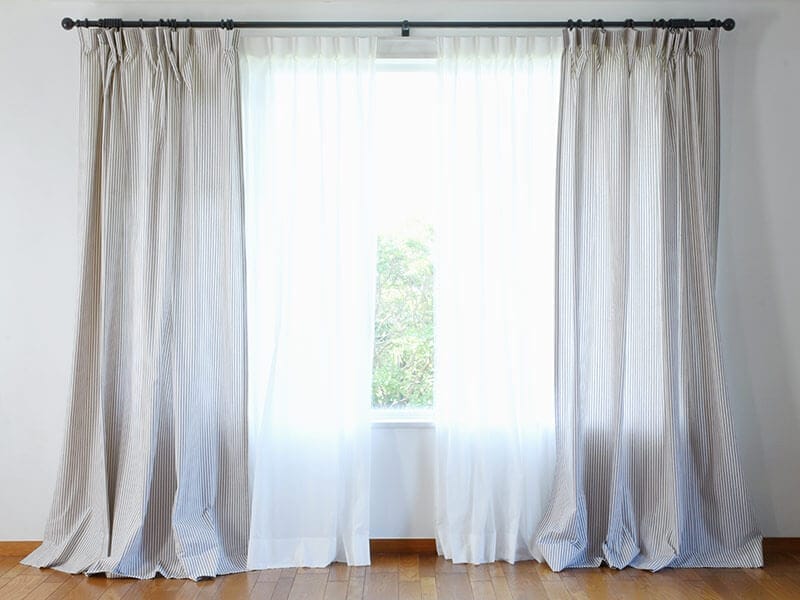 シンプルかつシャープな空間がお好みの方や、シンプルモダンで生地の風合いを強調させたい方にとてもお勧めのカーテンスタイルです。少なめのボリュームなので、生地の風合いや色柄が美しく強調されます。