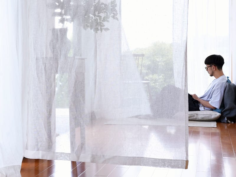 例えば、この画像のように間仕切りカーテンをNaturals 36の透け感のある生地にする場合、向こう側まで見えるので空間が広く感じられ解放感を生み出します。窓辺のカーテンにしても、モーニングコーヒーを飲みながら窓からの景色を楽しめたら気分もぐっと癒されますね。