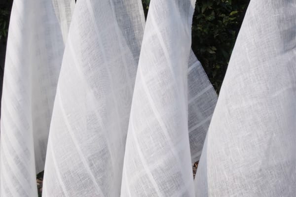 この窓辺に使用されているレース(モスリン)カーテン生地は、LIBECO社のNaturals 22 (Linen 100%)。適度な透け感があり、優しいストライプの間から窓外の光景を楽しむことが出来るリネンモスリン生地です。