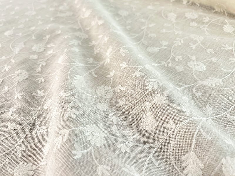 ナチュラルズシリーズのモスリン生地と近しい質感でコットンとポリエステルが混合されたバラ柄刺繍のSheer Desert Rose / シアーデザートローズは、張り感がありながら滑らかな柔らかさが感じられるモスリン生地。