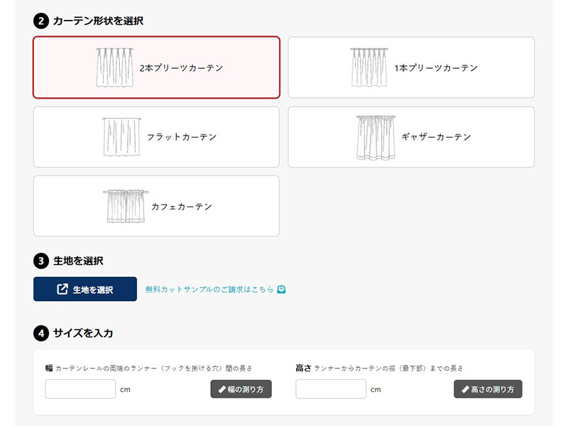 カーテン形状からスタイルを選び、生地を選択します。生地を選択をクリックするとすべての生地画像が表示されます。選びやすいように、ファブリックページで生地をあらかじめ確認しておくことをお勧めします。