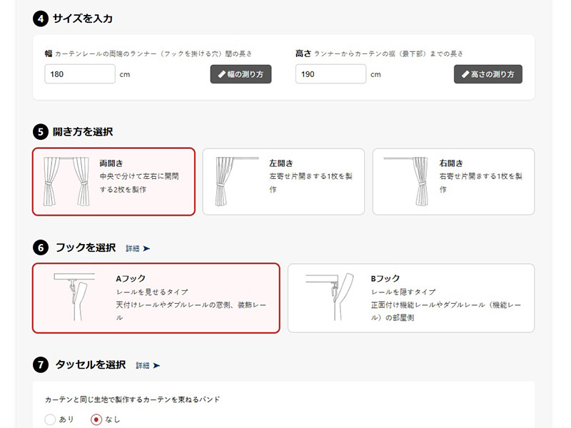 サイズはセンチで幅と高さを入力します。カーテンの開き方を選択し、フック種類を選択。必要なフック種類をあらかじめご確認くださいね。最後はタッセル(束ねるための帯)の有無を選択すると、カーテンの金額が表示されます。