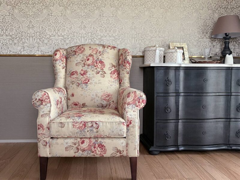 T様の別荘では、グレイの壁紙の部屋にはクラシカルなバラ柄のウィングチェア(Hawkswick Rose)と、ナチュラルモダンな空間にS2シングルソファ(Denim Vintage)がそれぞれの空間に選ばれました。