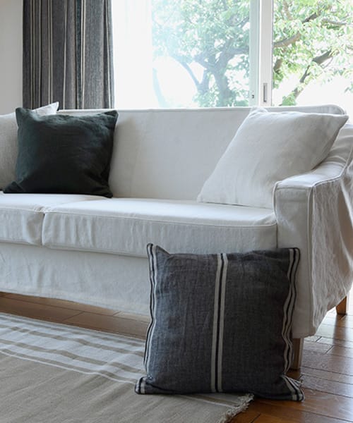 今回は、コットンリネン(Naturals 2)素材のホワイトソファに、ブラックリネンやフラックス(麻色)ストライプのクッションカバーを組み合わせてみました。