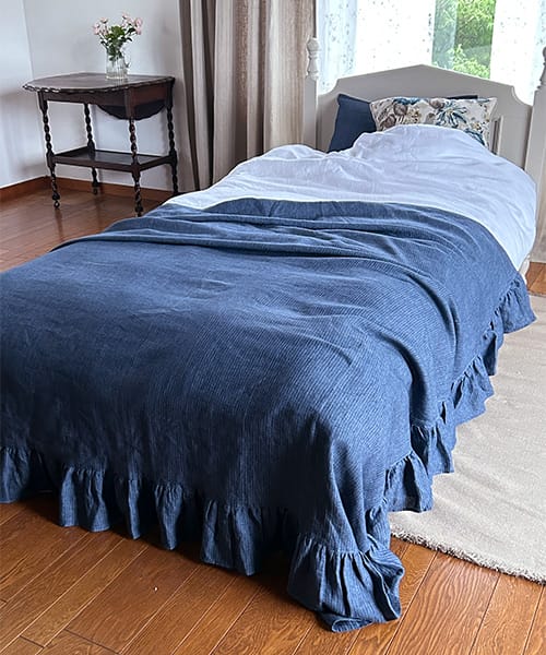 ベッド全体をふんわりと覆うことで、布の重なりが空間に奥行きをつくり、視覚的な温もりも生まれます。カラーはフラックスとネイビーの2色をご用意。明るい寝室にも、落ち着いたトーンの寝室にも馴染みやすく、リネンの自然な風合いが暮らしにそっと寄り添います。