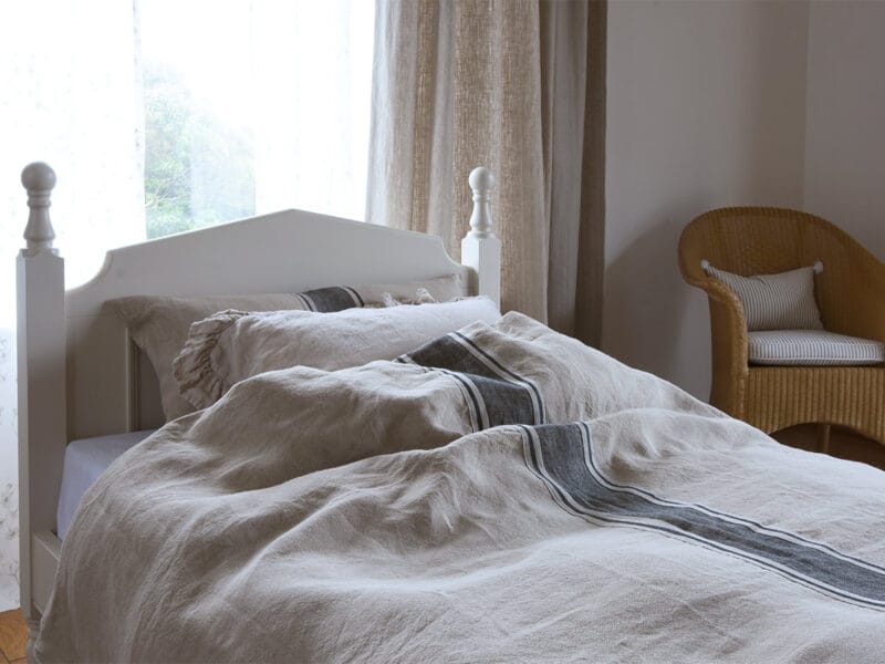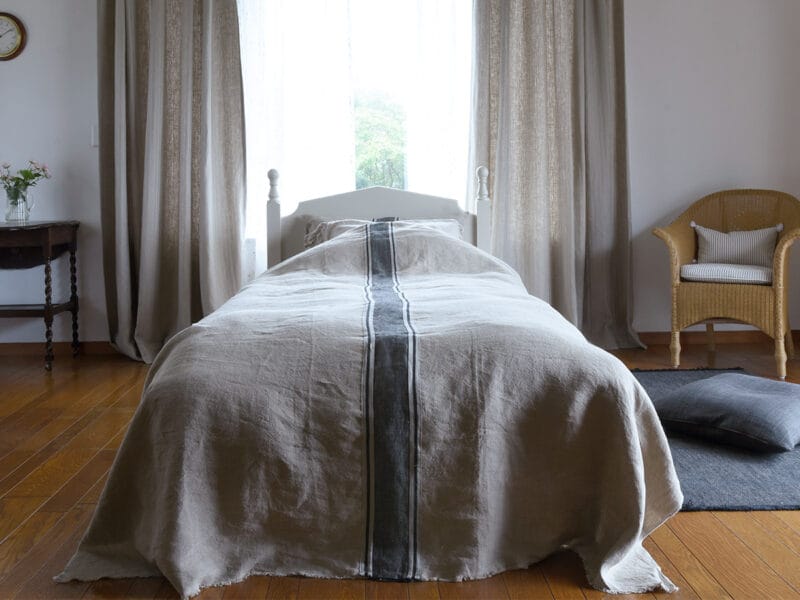 もう一つのお勧めは、中央に太めのラインが走る「ラスティックストライプ」のベッドカバー。目が詰まったフラックスカラーのリネン生地を使用し、洗いをかけることで生まれるくったりとしたヴィンテージ感が魅力です。
