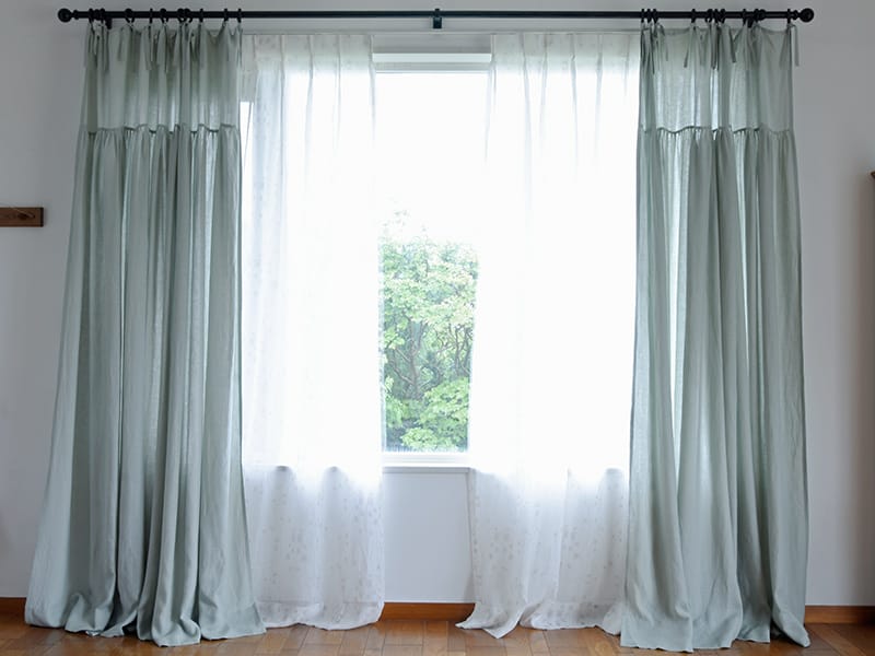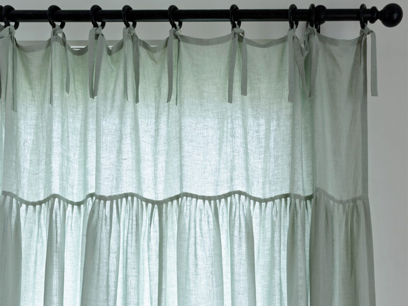 ベルギーLIBECO社のリネンを贅沢に使った、リボンギャザーカーテン「Naturals Mint / ナチュラルズ ミント」。淡いグリーンが、空間に静かな安らぎと高級感をもたらします。