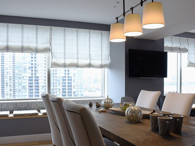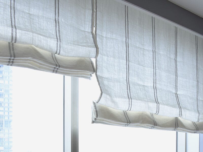 シンプルで洗練された印象を求める方には、「Lina Marine 6 / リナ マリン6」のリネンストライプローマンシェードがおすすめです。しっかりとしたホワイトリネンは、外光を透かすと柔らかな明るさを室内にもたらし、そこに浮かび上がる細めな2本のグレイストライプがさりげないアクセントに。