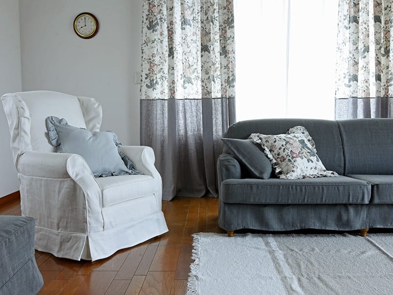 シックで落ち着きのある風合いのソファは、シックな空間だけのものではありません。このようにのようにボタニカルな切り替えカーテンにナチュラルズ スモークのS2トリプルソファを組み合わせることも可能なのです。