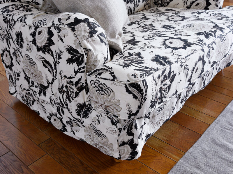 ベースがナチュラルベージュにモノトーンで描かれたボタニカル柄は、甘さを抑え挑発的で洗練された雰囲気を漂わせる、アートのようなリネン生地です。そのMariposaをクラシックで優しいフォルムのS2スタイルに合わせて、1.5シーターソファサイズのカバータイプで仕立てました。
