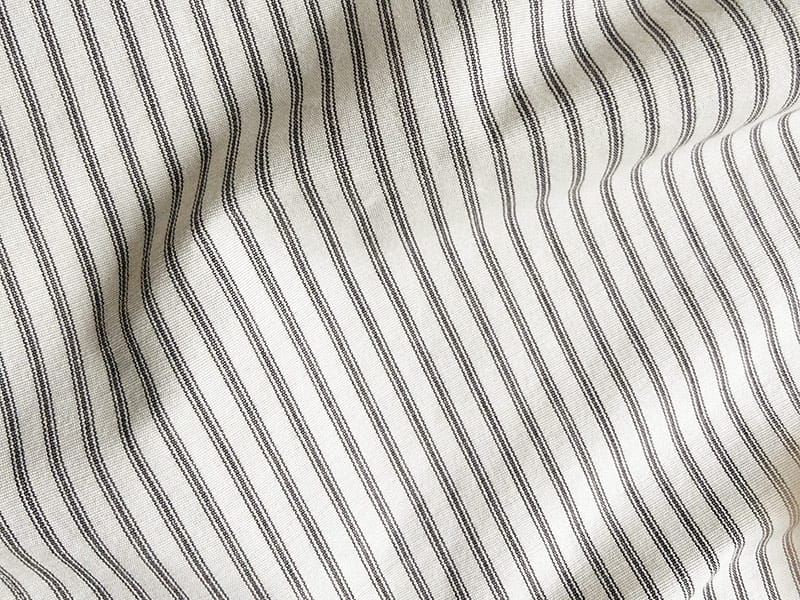 オフホワイト地にダークグレーのティッキングストライプが施されたグログラン織りのパリッとしたコットン生地です。軽やかな生地感のわりに密に織られたしっかりした手触りに安心を感じさせる生地になっています。