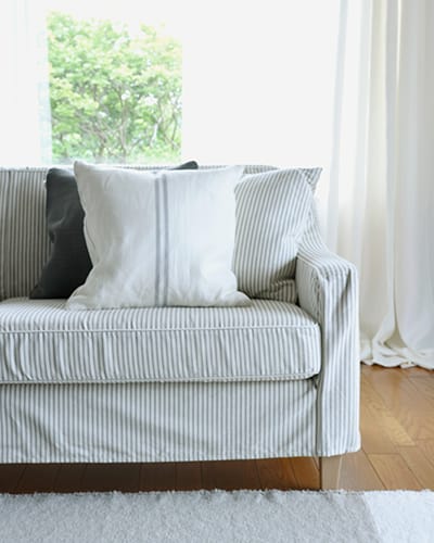 ソファに仕立てた際にオフホワイト地の印象が強くなり、空間に馴染みやすいコットンストライプ生地です。