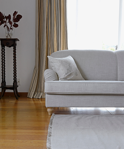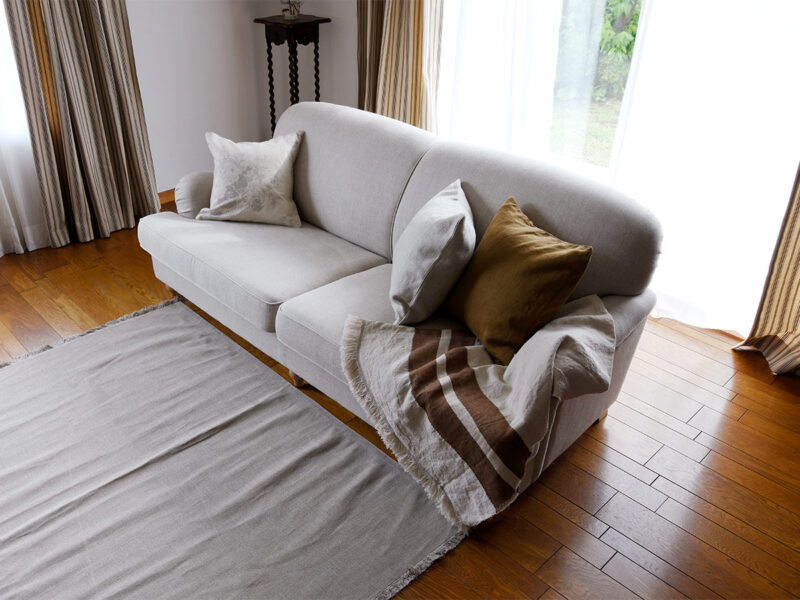 ソファに仕立てると生地表面の優しい光沢感や素朴で優しい色合い、生地の厚みからくる質感が加わって、全体に落ち着きと上質な雰囲気が生まれます。装飾に頼らず、生地そのものの質感を感じられる点が、このソファの利点です。