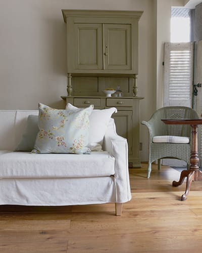 こちらの空間では優しいパインのアンティーク家具やクッションカバーを合わせました。淡い色合いの花柄クッション(Trinity White)などを添えることで、柔らかなイメージの空間に変わりますね。